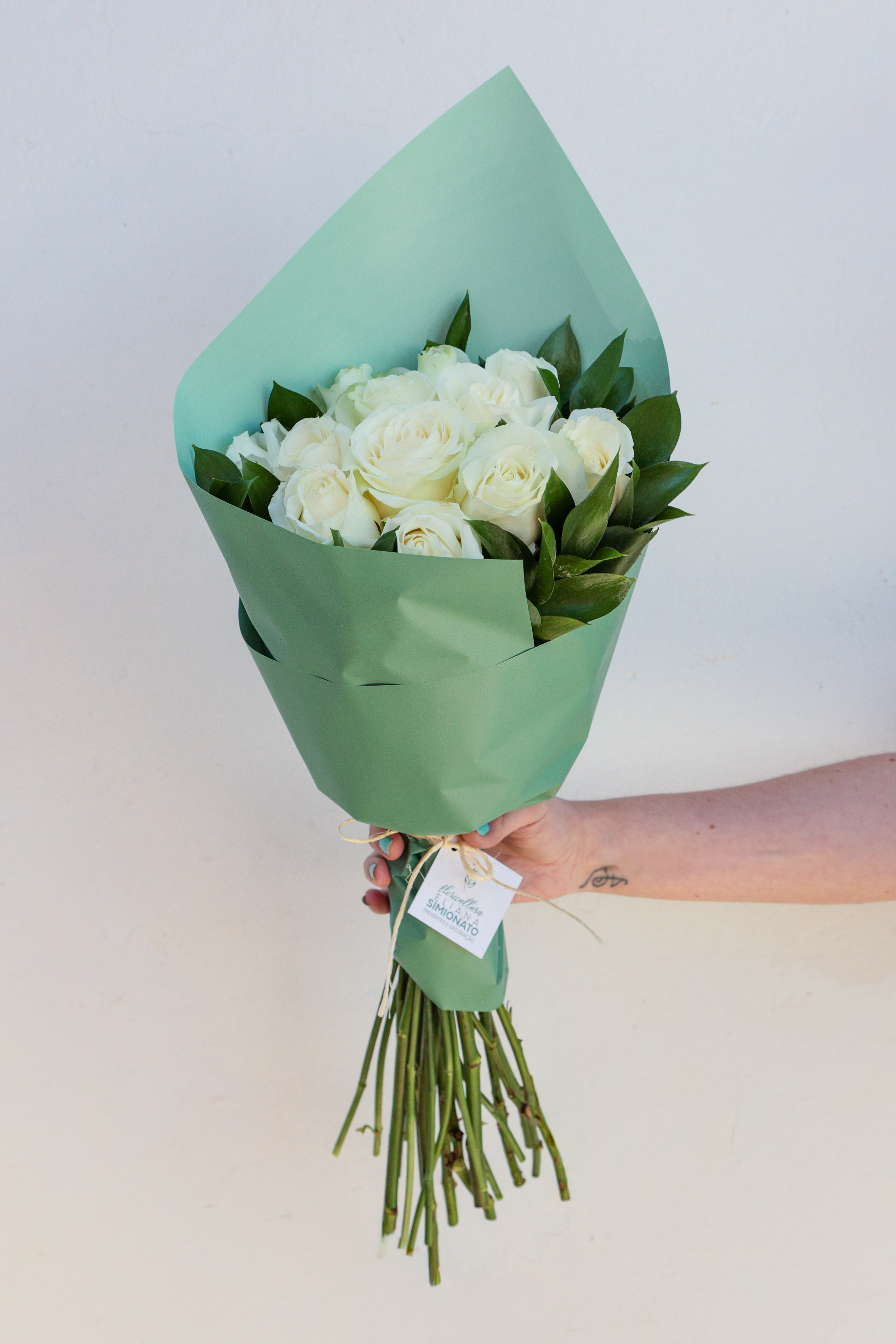 - Buquê com 12 rosas brancas e ruscus, em papel verde elegante, sofisticado e delicado.