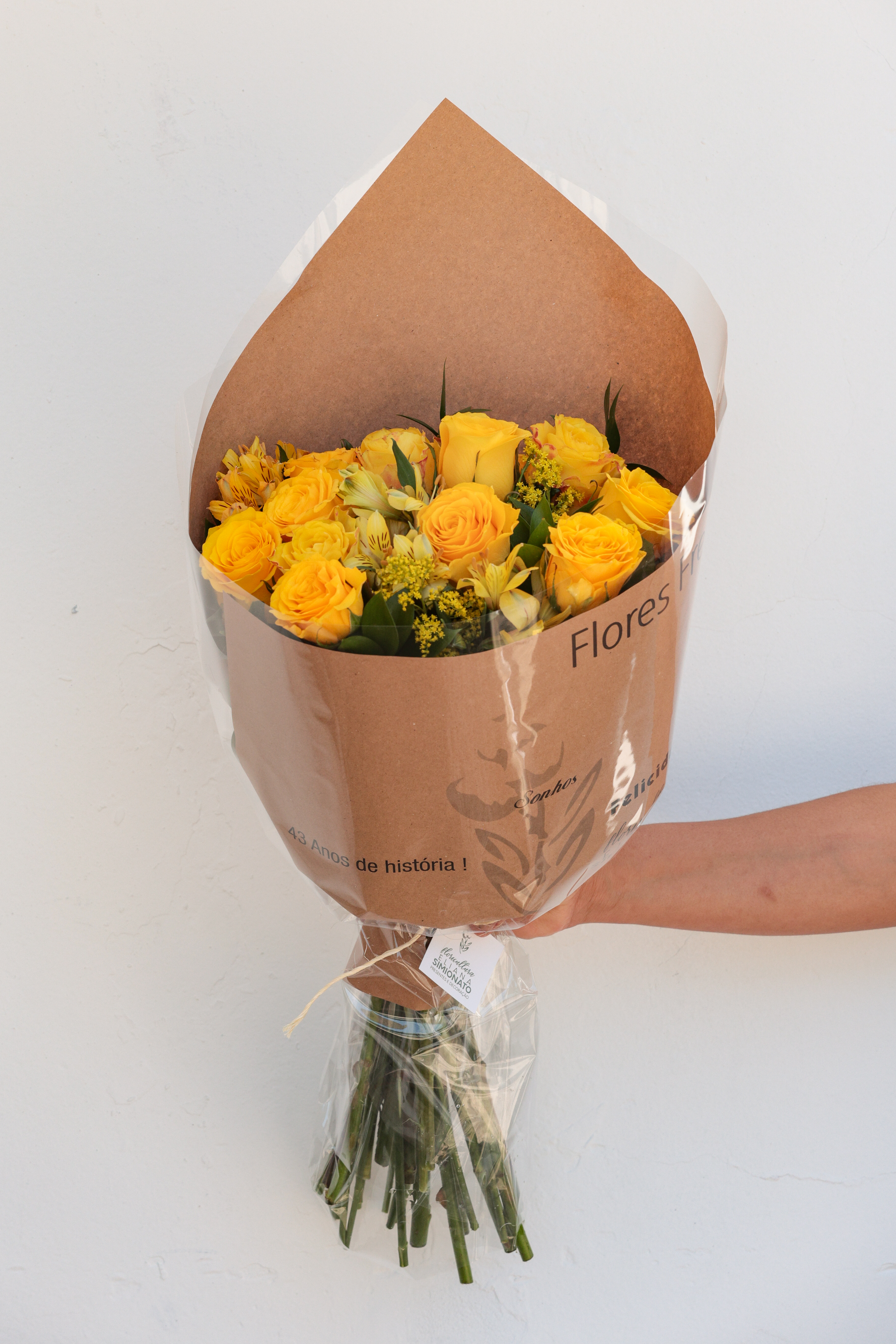 - Buquê com 12 rosas amarelas, vibrante e alegre.