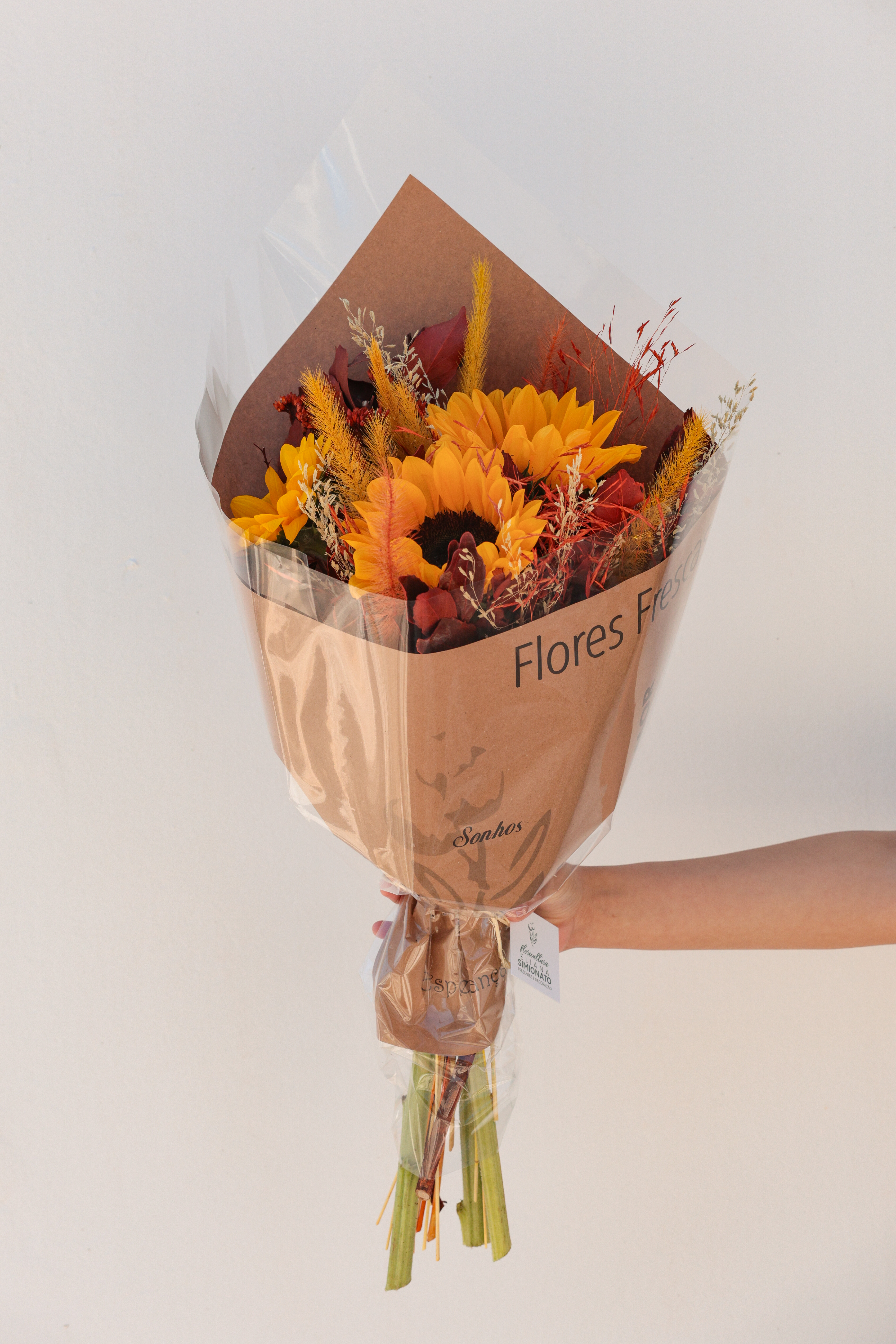 Este buquê traz 3 girassóis radiantes combinados com flores desidratadas, resultando em um arranjo moderno e cheio de personalidade. Uma opção marcante para presentear com estilo.