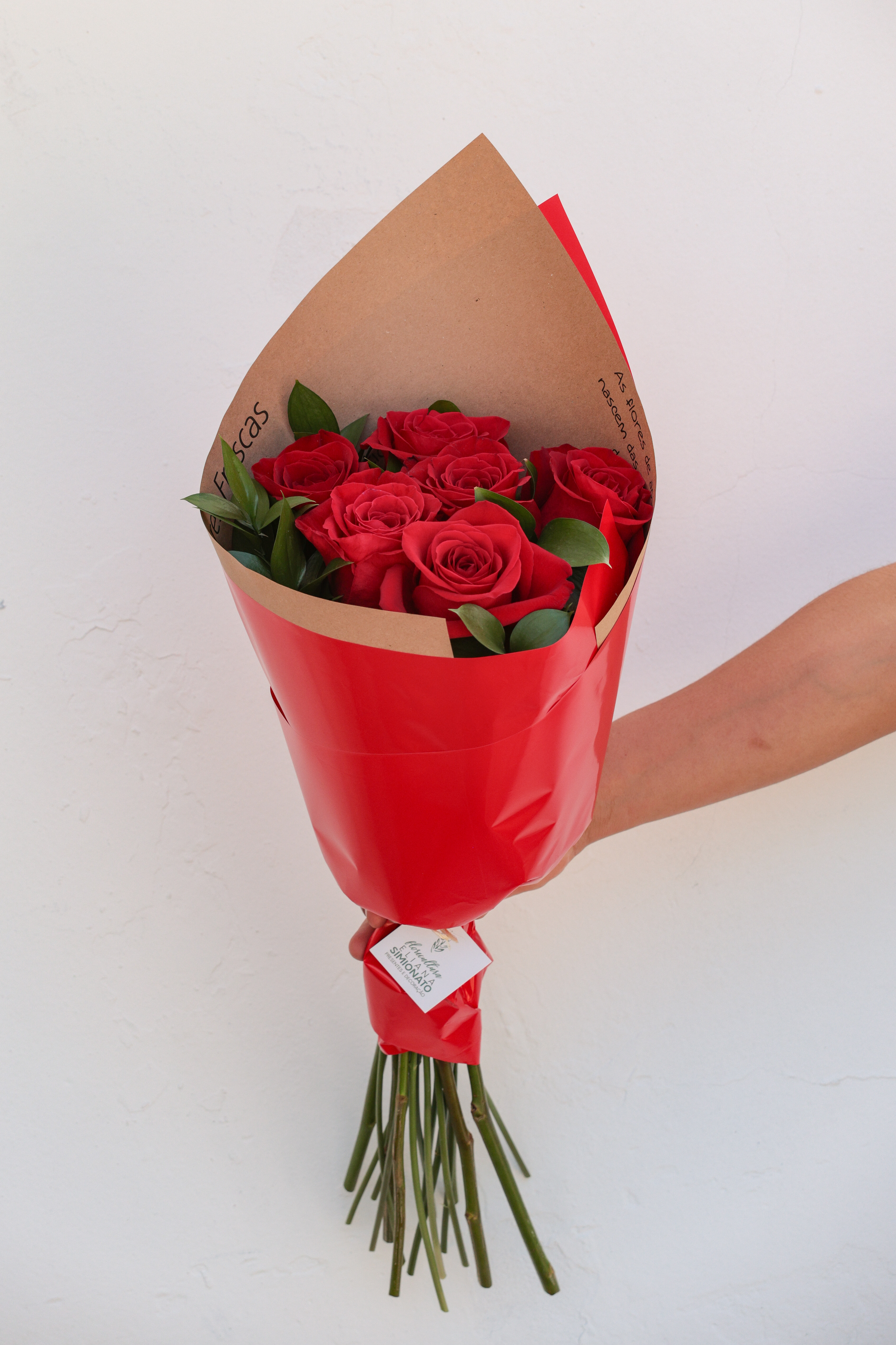- Buquê premium com 6 rosas colombianas vermelhas, luxuoso e apaixonante, embalado em papel vermelho com ruscus.