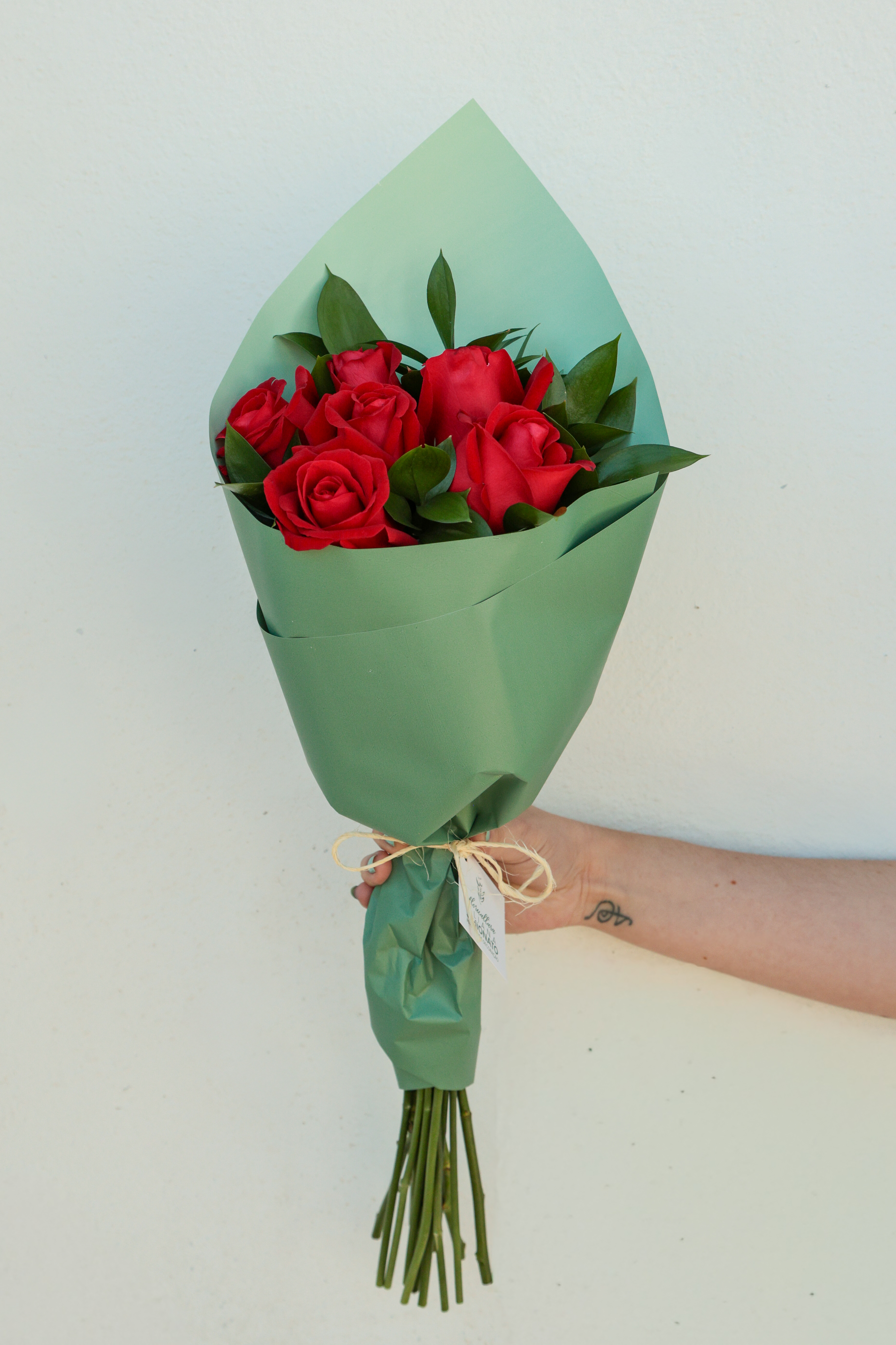 - Buquê com 6 rosas vermelhas e ruscus, embalado em papel verde elegante, sofisticado e apaixonante.