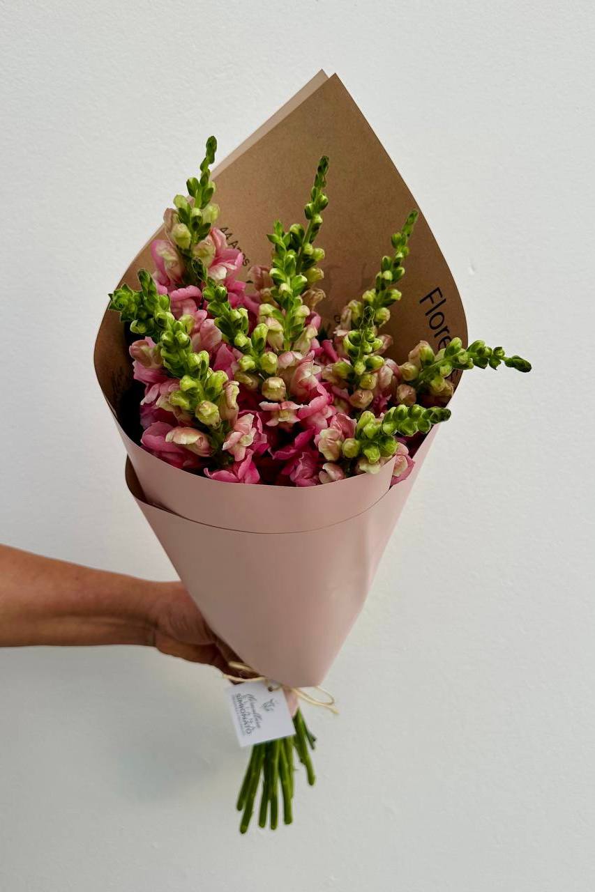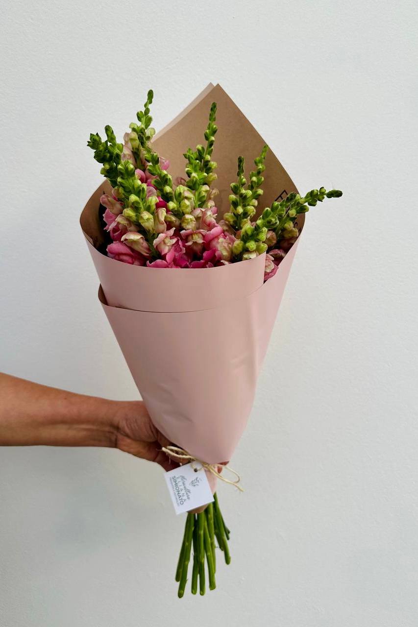 A Boca-de-Leão rosa é conhecida por sua beleza singular e pelo formato encantador de suas flores. Neste buquê, ela ganha ainda mais destaque, revelando suavidade e um charme romântico que transforma qualquer momento em algo especial.