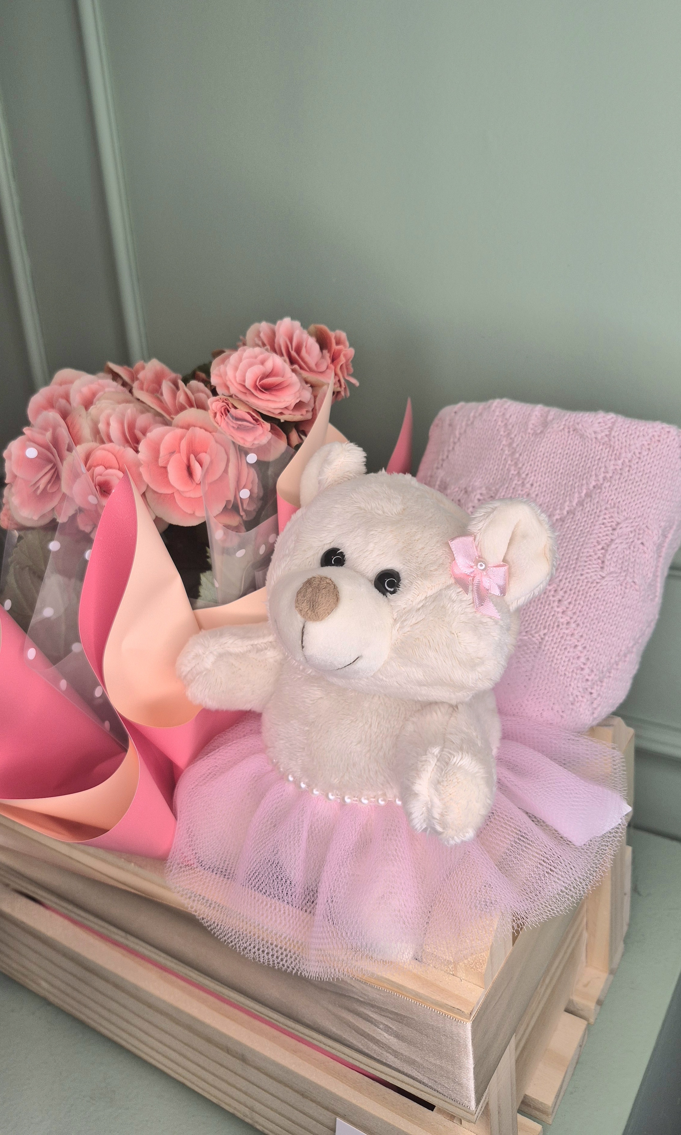 - Kit Maternidade no caixote de madeira com ursinha bailarina, begônia e manta rosa — um presente delicado e aconchegante para celebrar a chegada do bebê.