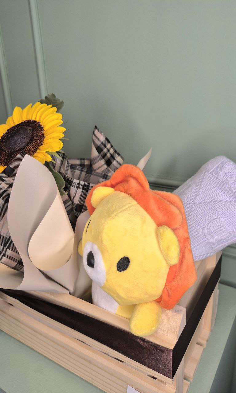 - Kit Maternidade no caixote de madeira com ursinho de leão, girassol e manta branca — um presente carinhoso para celebrar a chegada do bebê.