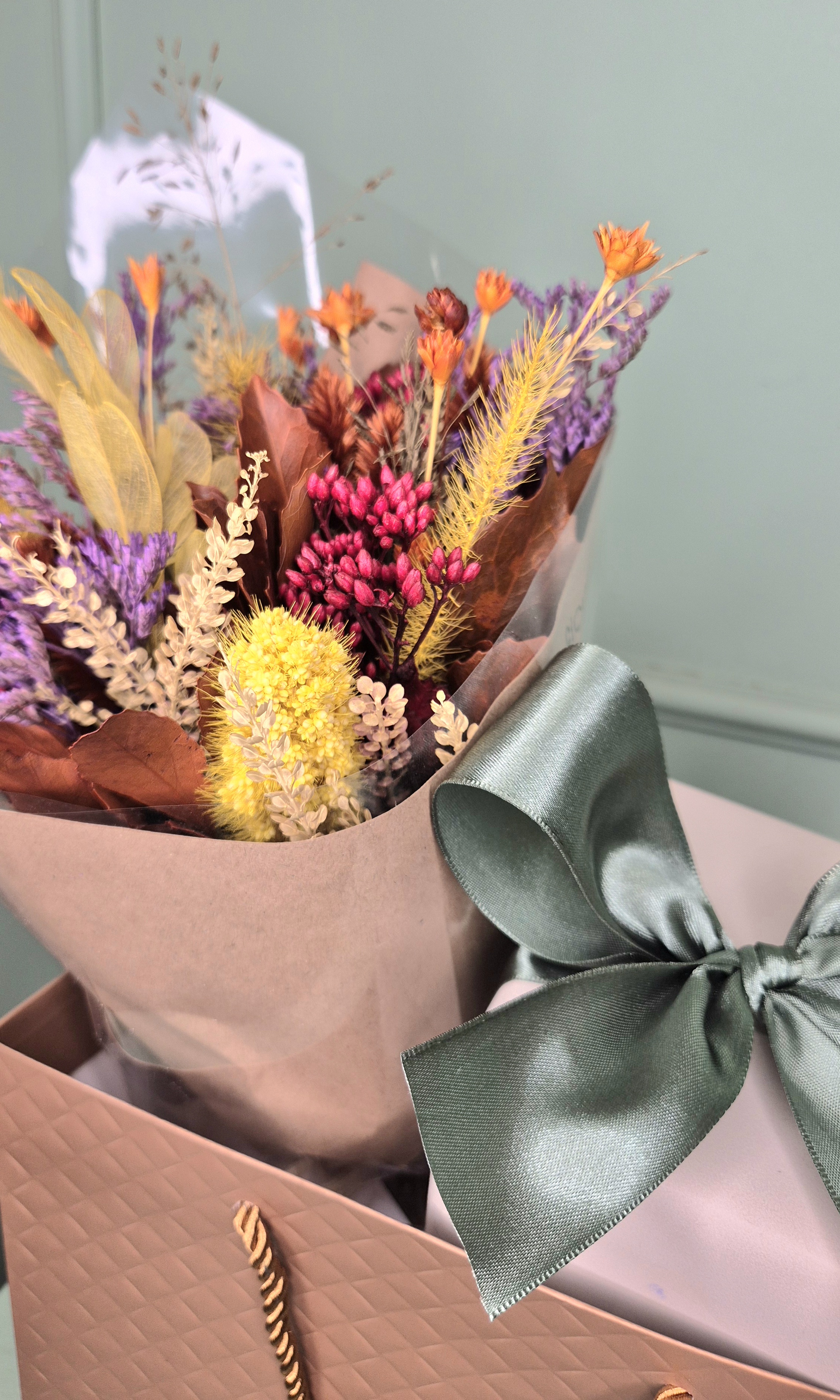 As flores desidratadas são perfeitas para quem aprecia beleza duradoura e charme natural. Combinando tons suaves, este buquê transmite delicadeza e elegância, sendo uma escolha única para presentear em momentos especiais ou para decorar ambientes com um toque romântico e atemporal.